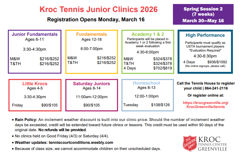 Kroc 101 and 102 are 4-week adult beginner clinics that start on the first Wednesday of each month.