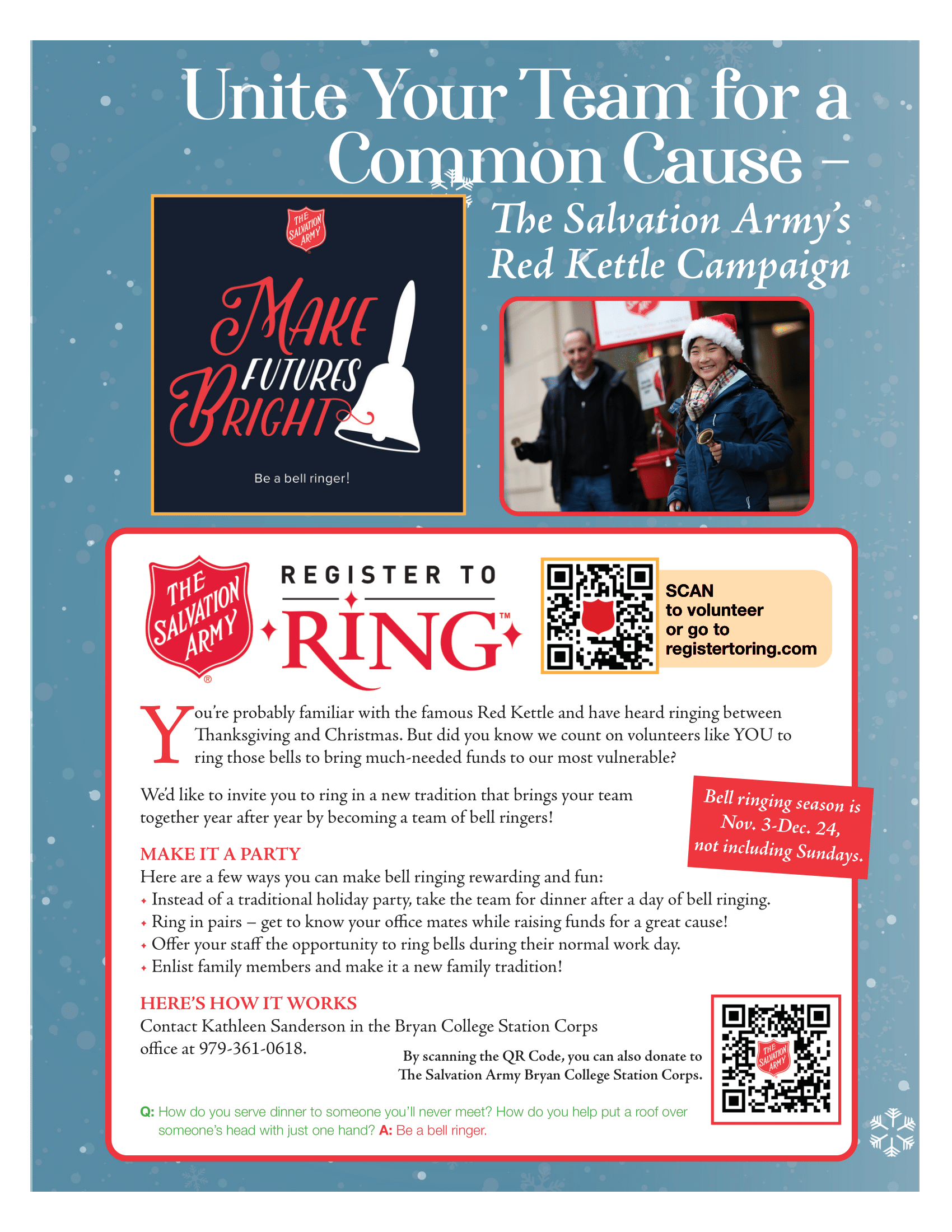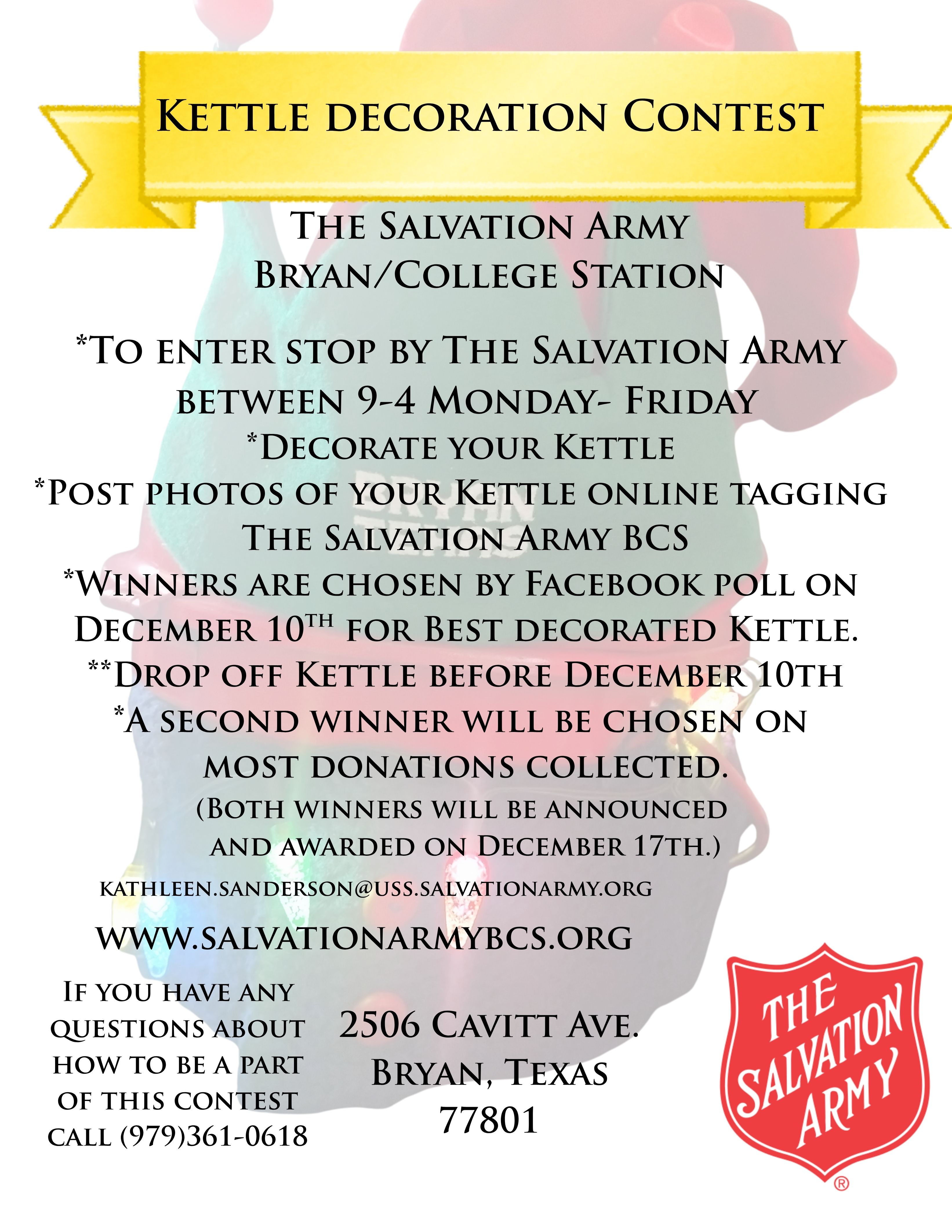 To learn more about sponsoring a Kettle or to schedule a tour call (979)361-0618 or email Kathleen.sanderson@uss.salvationarmy.org