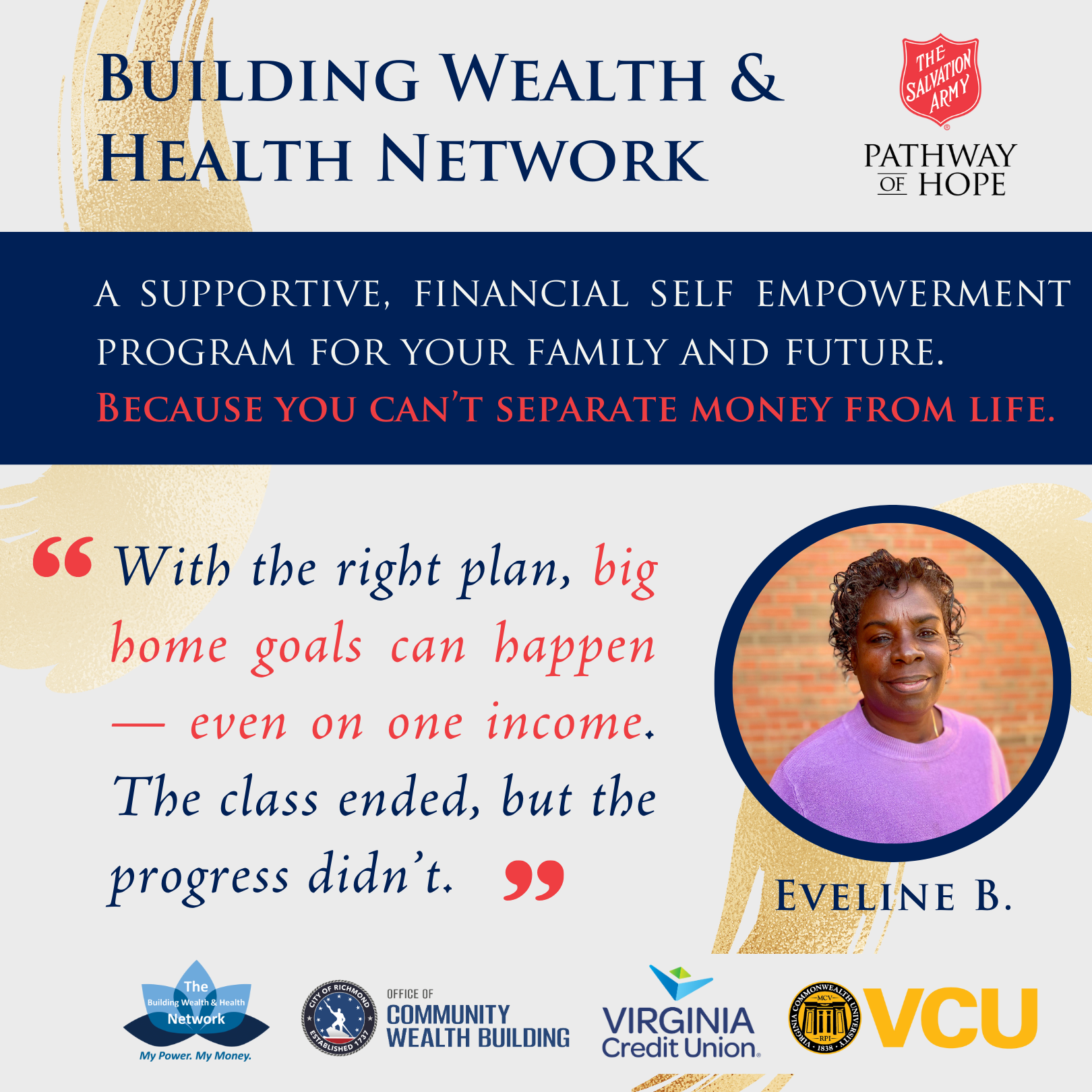 Eveline B. first learned about the Building Wealth and Health Network (the Network) through a newsletter. The message caught her attention not only because she wanted to strengthen her finances, but also because she was also looking for community — women with similar goals, asking the same questions, and working toward a more stable future.