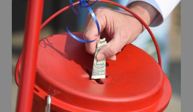 Every year from just before Thanksgiving to Christmas Eve, "bell ringers" sign up to stand next to a red kettle outside stores or shopping centers and ring a bell. The kettles collect funds that the Salvation Army uses throughout the year to support local programs.
