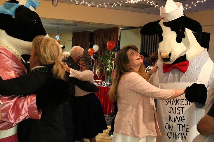 uick, General Manager of Rome Radio Partners and past board chairman for The Salvation Army of Rome, GA, and local radio personality Nelle Reagan, served as co-masters of ceremonies for the evening. They also judged the hula-hoop contest. Adding to the fundraising effort, local business donated items for a silent auction. Food was catered by Steak and Shake complete with 50's style milkshakes topped with a Maraschino cherry. As an added treat, the Chick-fil-a cows kept the dance floor a center of fun and entertainment all evening long.