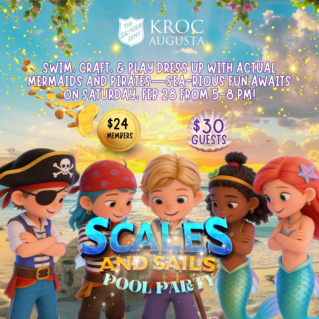 Dive into a magical night at the Scales & Sails Pool Party at the Kroc pool! Kids, ages 5 to 12, are invited to swim, craft, and play alongside mermaids and pirates for an evening of fun. Kids are encouraged to dress up as their favorite mermaids or pirates and enjoy themed activities, splashing in the pool, and unforgettable photo moments. Click the button below to register!