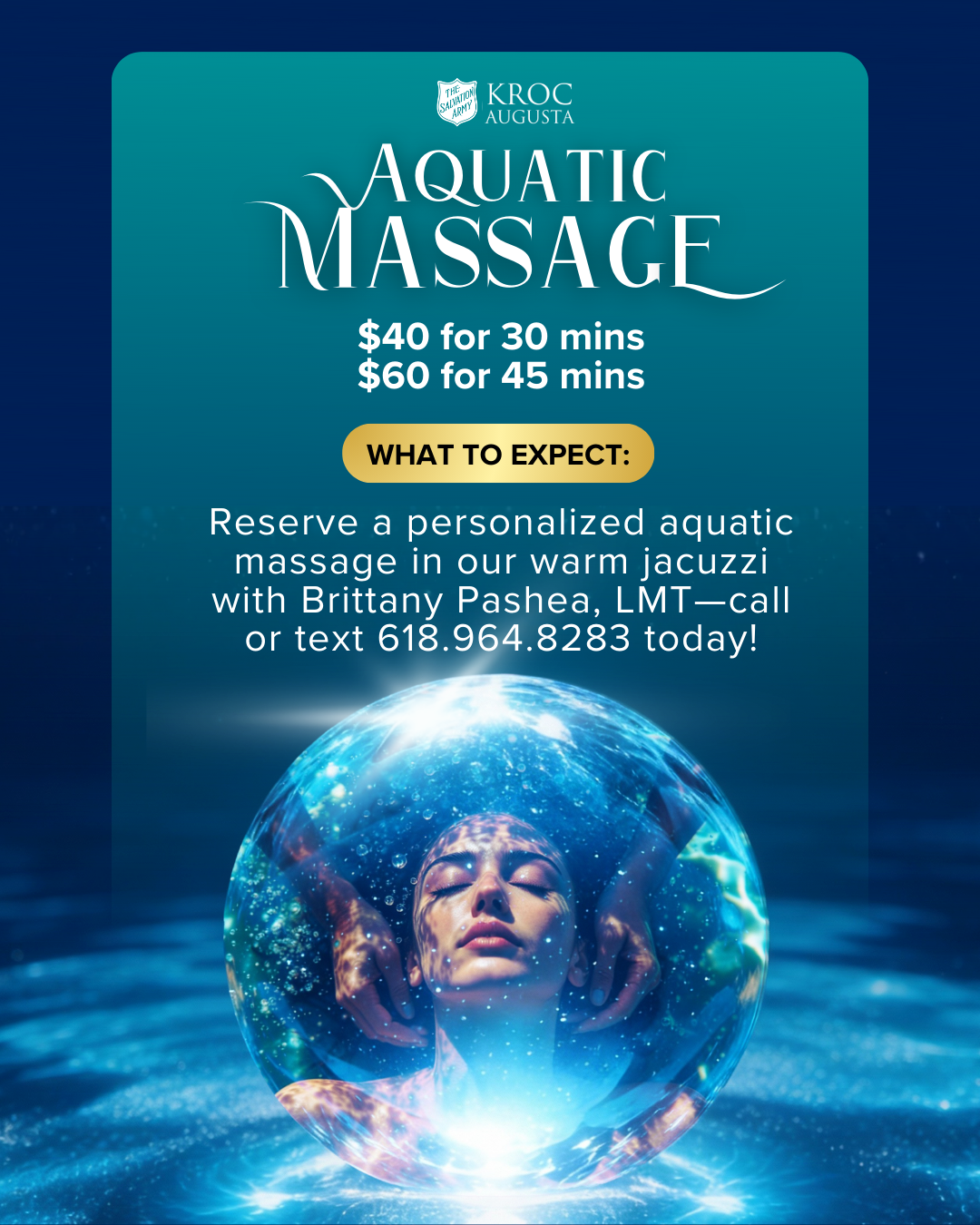 Experience deep relaxation and gentle therapeutic relief with Aquatic Massage, now available at the Kroc Center of Augusta. This unique service takes place in our warm spa/hot tub and combines the calming properties of water with hands-on massage techniques designed to ease tension, support mobility, and promote overall wellness.