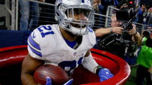 After running 2 yards into the end zone to take a 17-3 lead against the Tampa Bay Buccaneers on Sunday night, Elliott ran into an over-sized Salvation Army kettle and ducked down into it before slowly coming out. It was Elliott’s 13 touchdown run this year, setting a new franchise record.